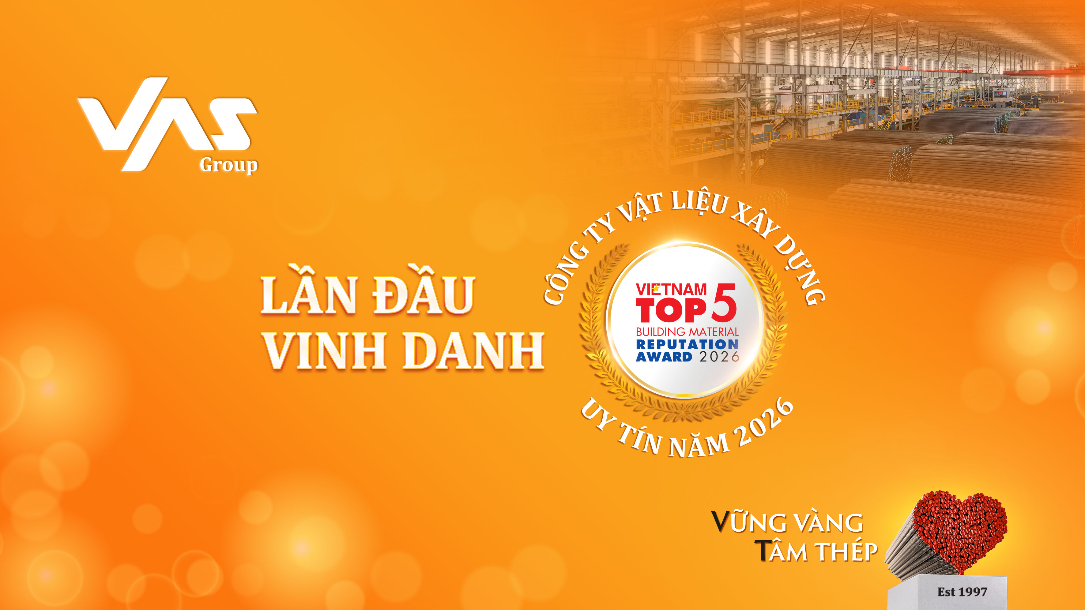 VAS chính thức ghi tên vào Top 5 Công ty Vật liệu Xây dựng Uy tín năm 2026 – nhóm sản phẩm sắt thép tôn, cột mốc ghi nhận vị thế ngày càng rõ nét của thương hiệu trên thị trường. Thành quả này thắp sáng niềm tự hào trong mỗi VASers và đối tác đồng hành, làm rạng rỡ một hành trình đã qua.